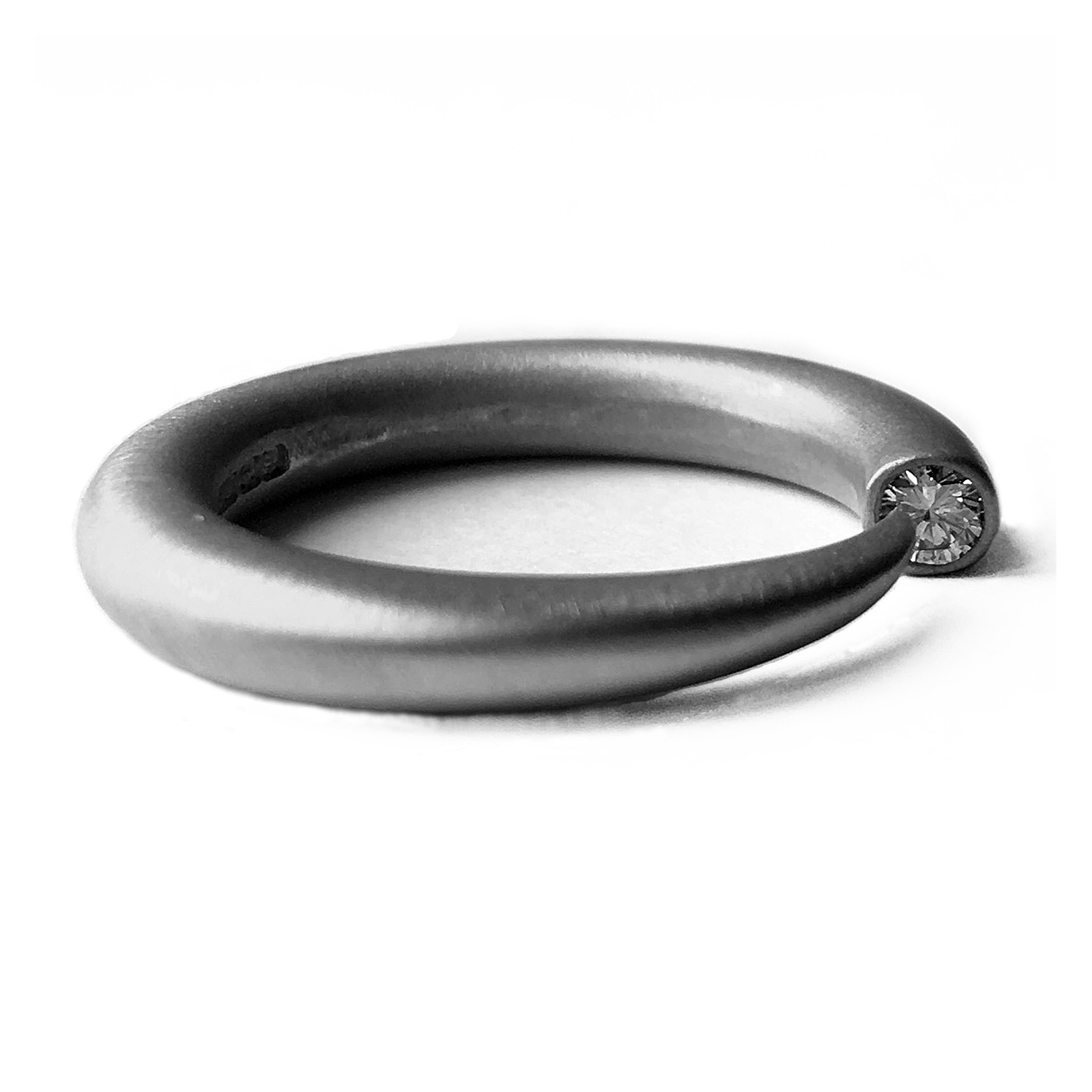 The 18ct 10pt diamond wiggly ring has a comfortable rounded band which tapers to a point from 4mm and is end set with a brilliant 0.1ct vsfg diamond. It is a beautiful pure design.