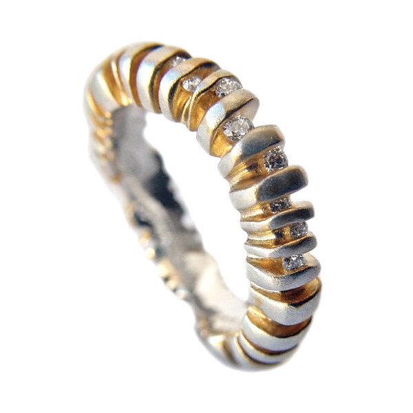The 8 diamond jewelled silver band is an understated stunning new design. The 8 brilliant vsfg diamonds glisten from within the golden grooved interior. The diamond settings allow maximum light & sparkle. The handmade undulating carved solid silver band has contrasting 22ct gold plating. Approximate maximum band dimensions are 3.8mm to 4.5mm. This unusual jewelled ring is a perfect eternity ring or dress ring suitable for every occasion.