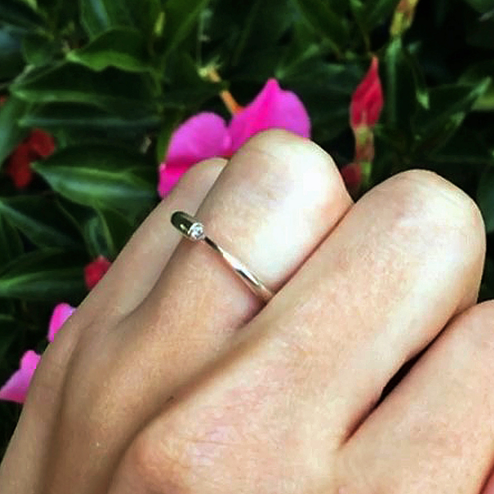 The narrow silver diamond ring has a comfortable rounded band which tapers to a point from 3mm and is end set with a brilliant 0.03ct vsfg diamond. It is a beautiful pure design.