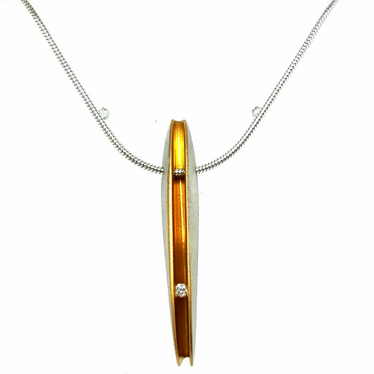 Large silver shell diamond pendant with 3pt (0.03ct vsfg) diamond set within a rich 22ct gold plated interior. An eye catching and unusual necklace in sterling silver. A brilliant 0.03ct diamond is captured within the two silver folds and contrasts perfectly with the rich 22ct gold plated interior. The diamond is tension set which allows maximum light around the stone. This simple elegant pendant is perfect for all occasions and also makes a wonderful gift.