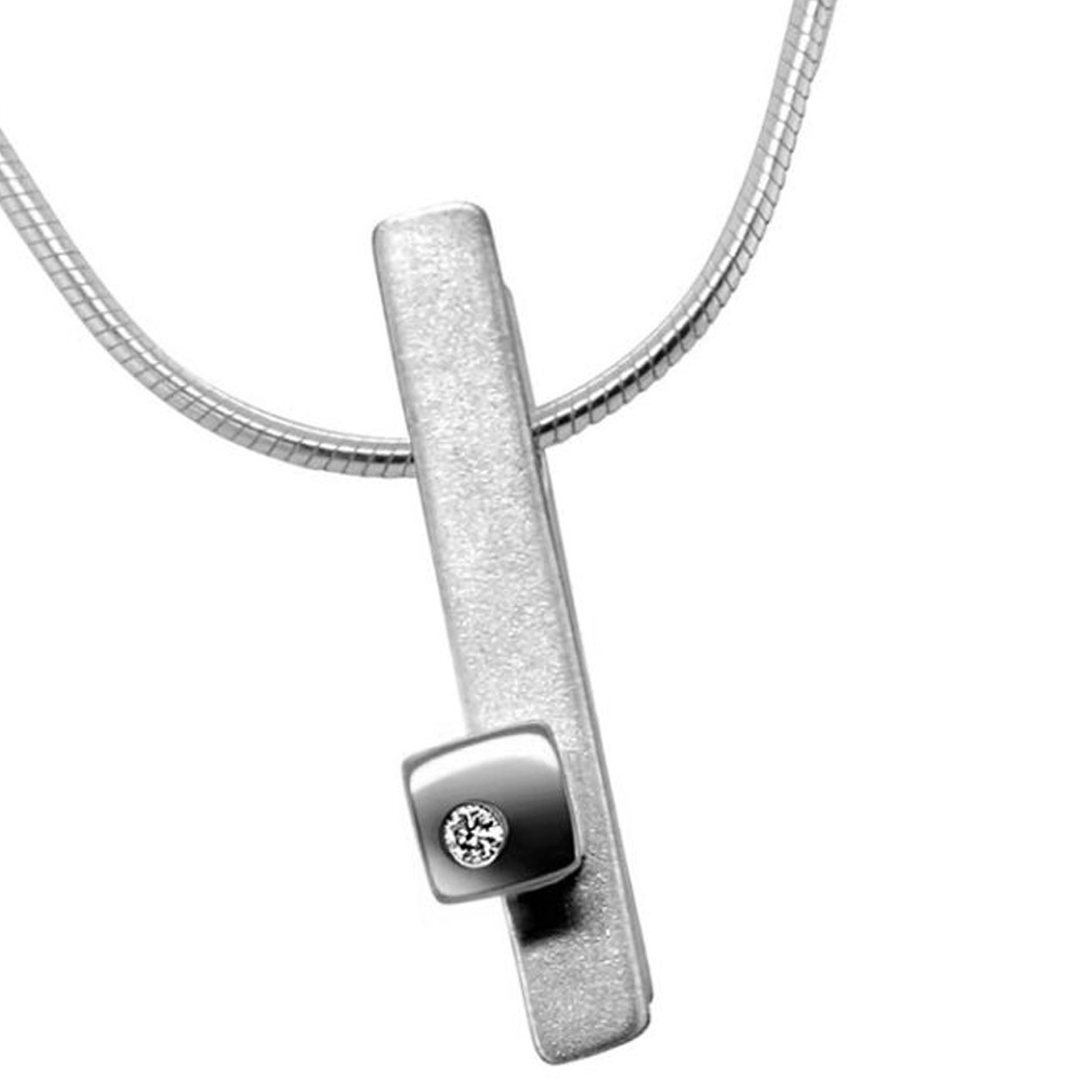 Silver diamond ingot. The solid silver pendant is set with a sparkling 0.02ct vsfg diamond and has square silver detail. It has approximate dimensions of length 24mm, width 4mm, depth 5mm. The diamond necklace is perfect for everyday wear or special occasions.