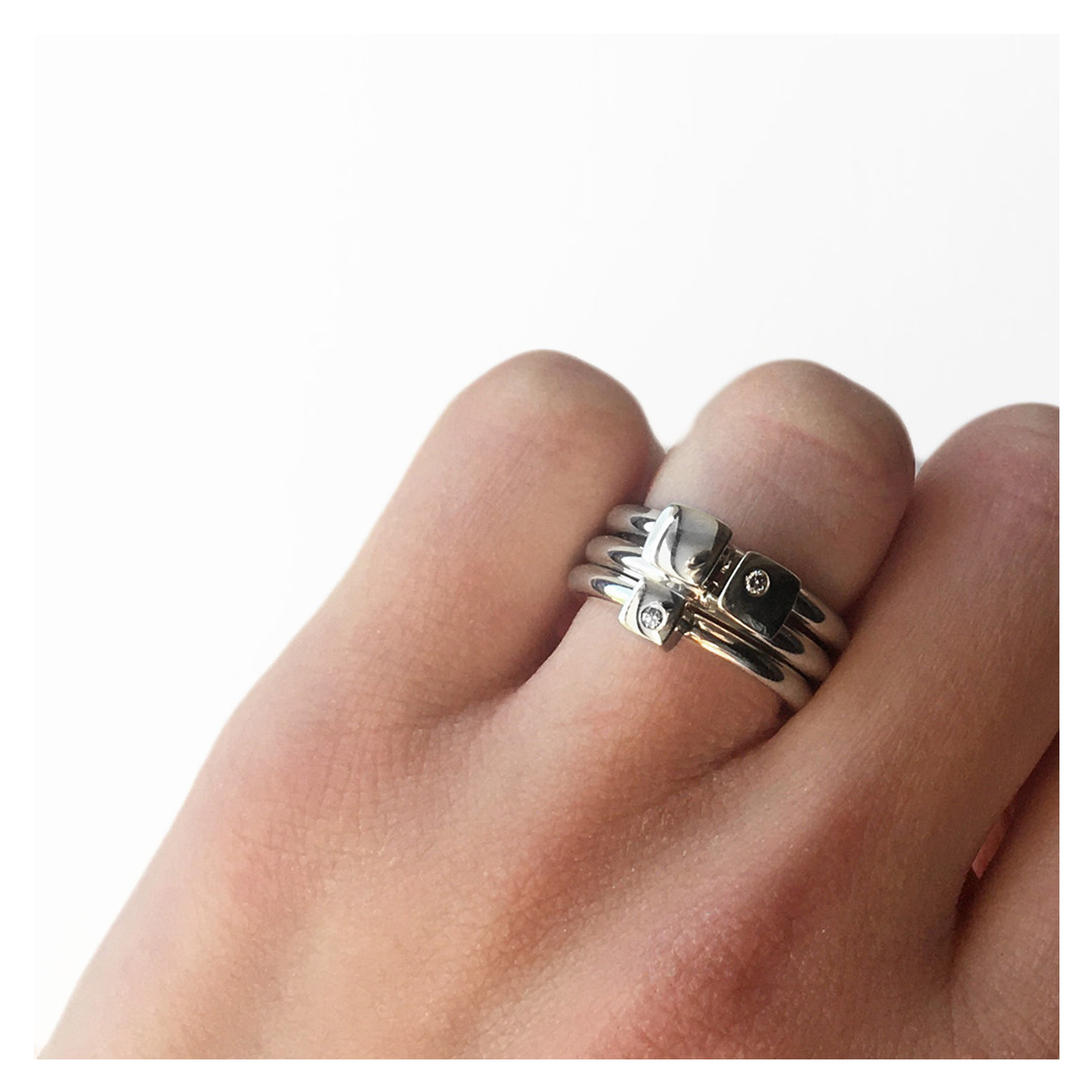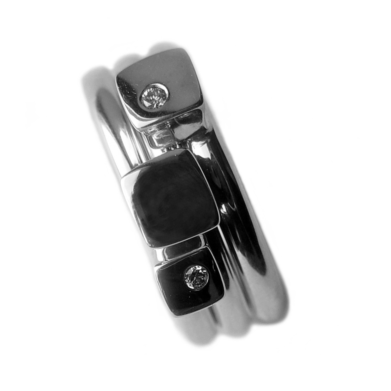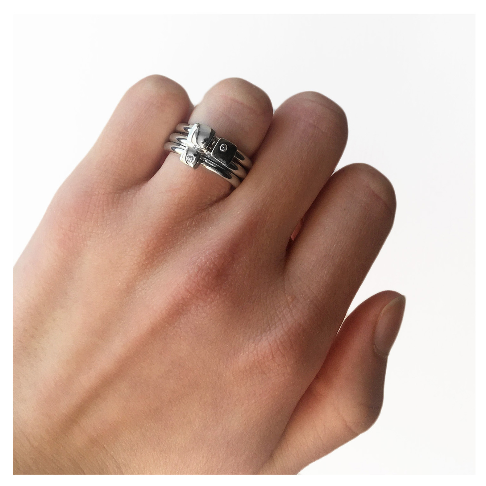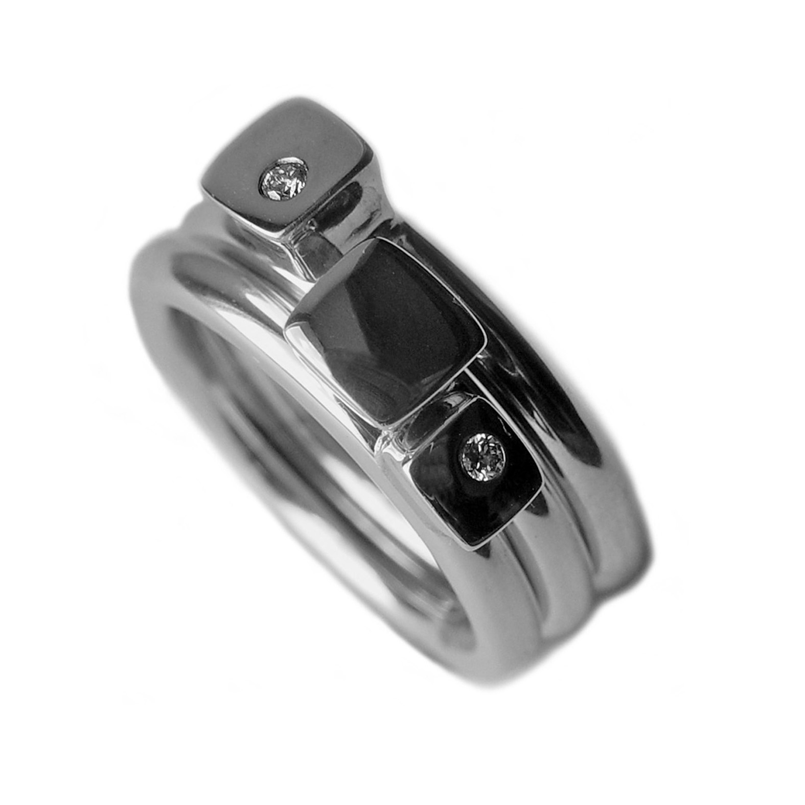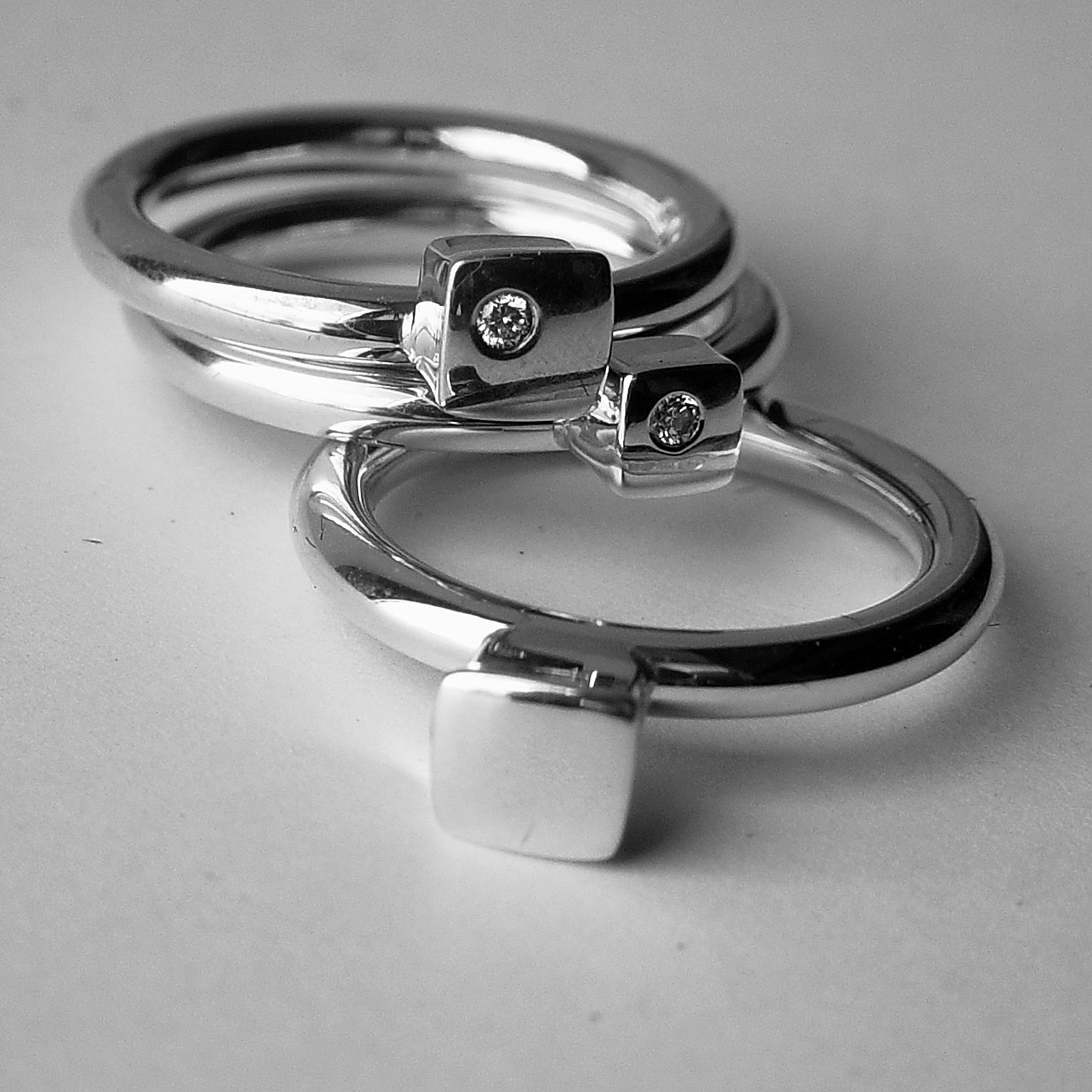 This silver ring set with diamonds (ring set 10) consists of three unique rings. Each ring is 2.5mm round with a comfortable rounded band (maximum width of the ring set is 7.5mm). Each ring has silver detailing, and two of the rings are set with 0.02ct vsfg diamonds. The ring set is also available with 18ct gold detailing or in an all 18ct yellow gold version. A versatile stacking ring set, the rings can be worn in any combination or can also be bought individually on request.